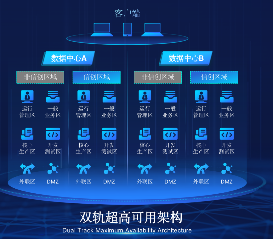 云闪付在企业面临自主创新IT基础重构过程中,推出的全新架构双轨超高可用架构(简称DTMAA),在双活数据中心的分区调度基础上,添加每个数据中心内信创域和非信创域的分域调度,来实现分区分域协同的多活双轨超高可用。